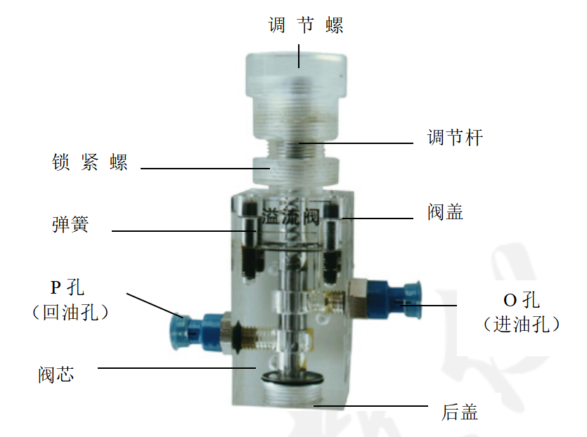 2、透明液壓實(shí)驗(yàn)臺(tái)的溢流閥結(jié)構(gòu)上參考了國產(chǎn)P-63 B 型低壓直動(dòng)式溢流閥、其閥體閥蓋、鎖緊螺母、調(diào)節(jié)螺母、螺塞等采用了進(jìn)口透明有機(jī)玻璃材料精制而成,閥芯、調(diào)節(jié)桿采用了45號(hào)中碳鋼材料。并配合彈簧,油接頭,密封圈等標(biāo)準(zhǔn)件裝配而成,通過它可明確的觀察到閥芯、彈簧、油孔等結(jié)構(gòu)及其運(yùn)行過程,具有形象逼真,工作可靠等優(yōu)點(diǎn),它既可作為教學(xué)模型,也可作為液壓實(shí)驗(yàn)元件進(jìn)行實(shí)驗(yàn)演示。