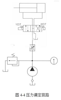雙作用油缸,溢流閥,調(diào)速閥,壓力表,三位四通